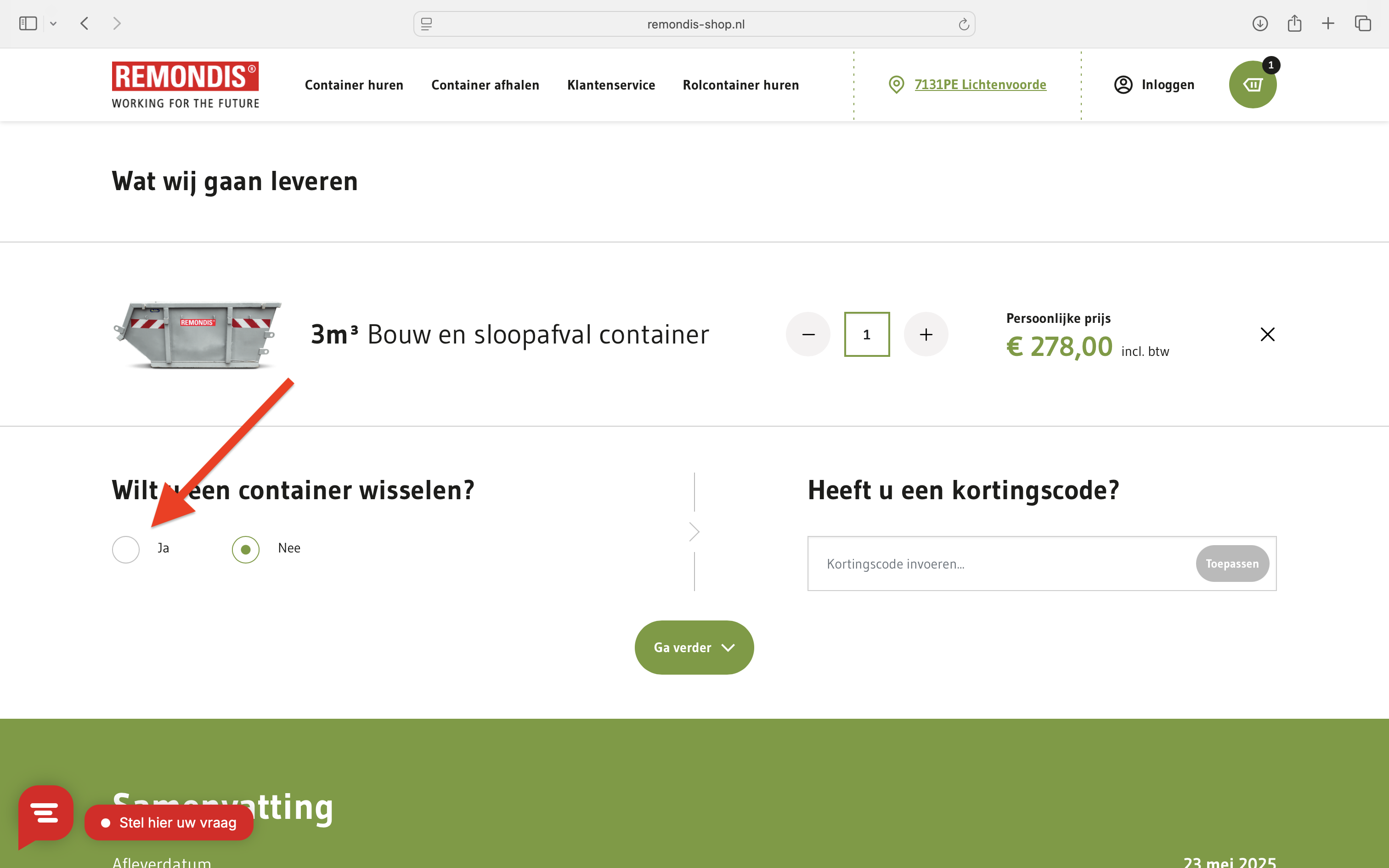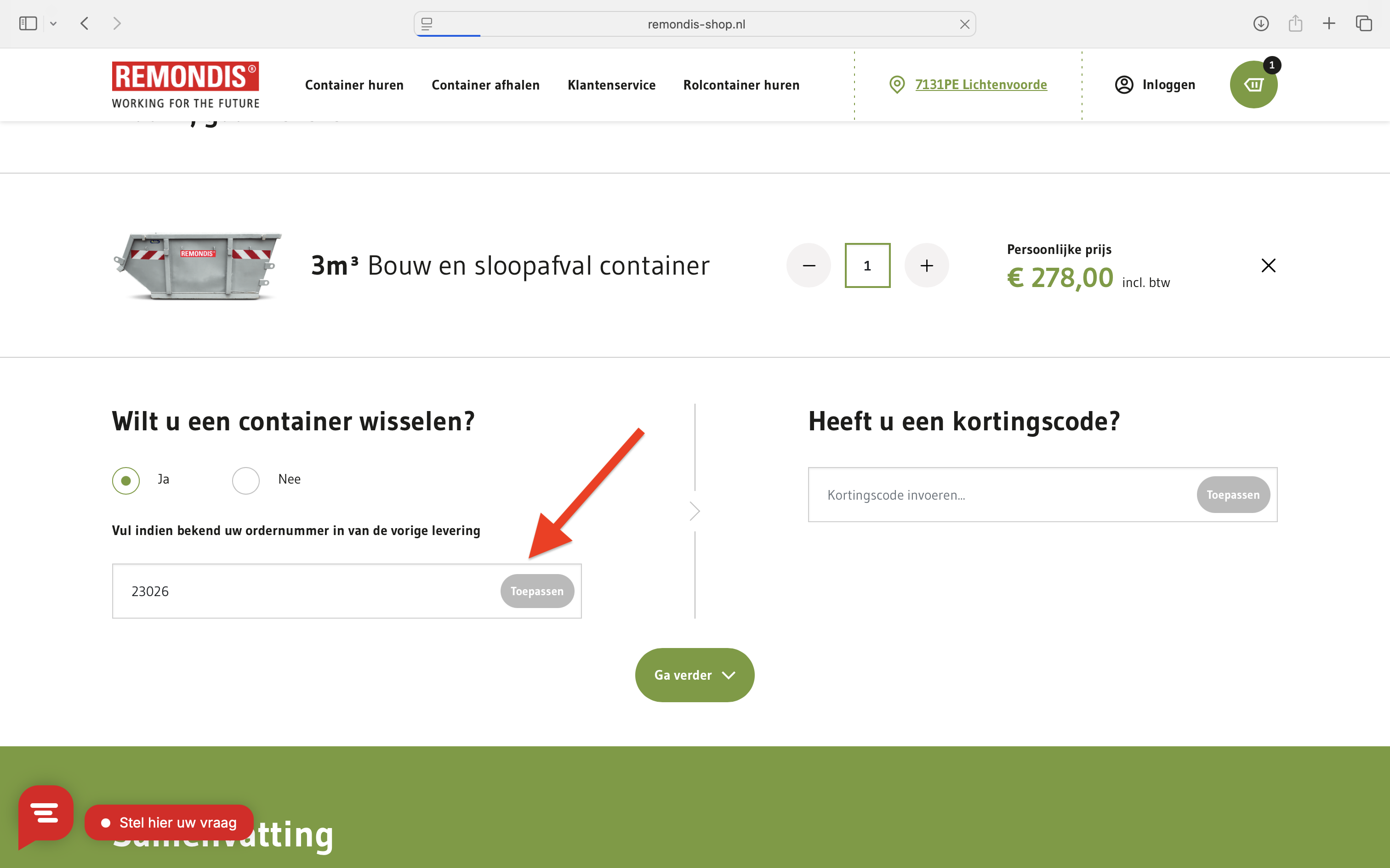Onderaan de pagina ziet u onder uw bestelling het kopje "Wilt u een container wisselen?".