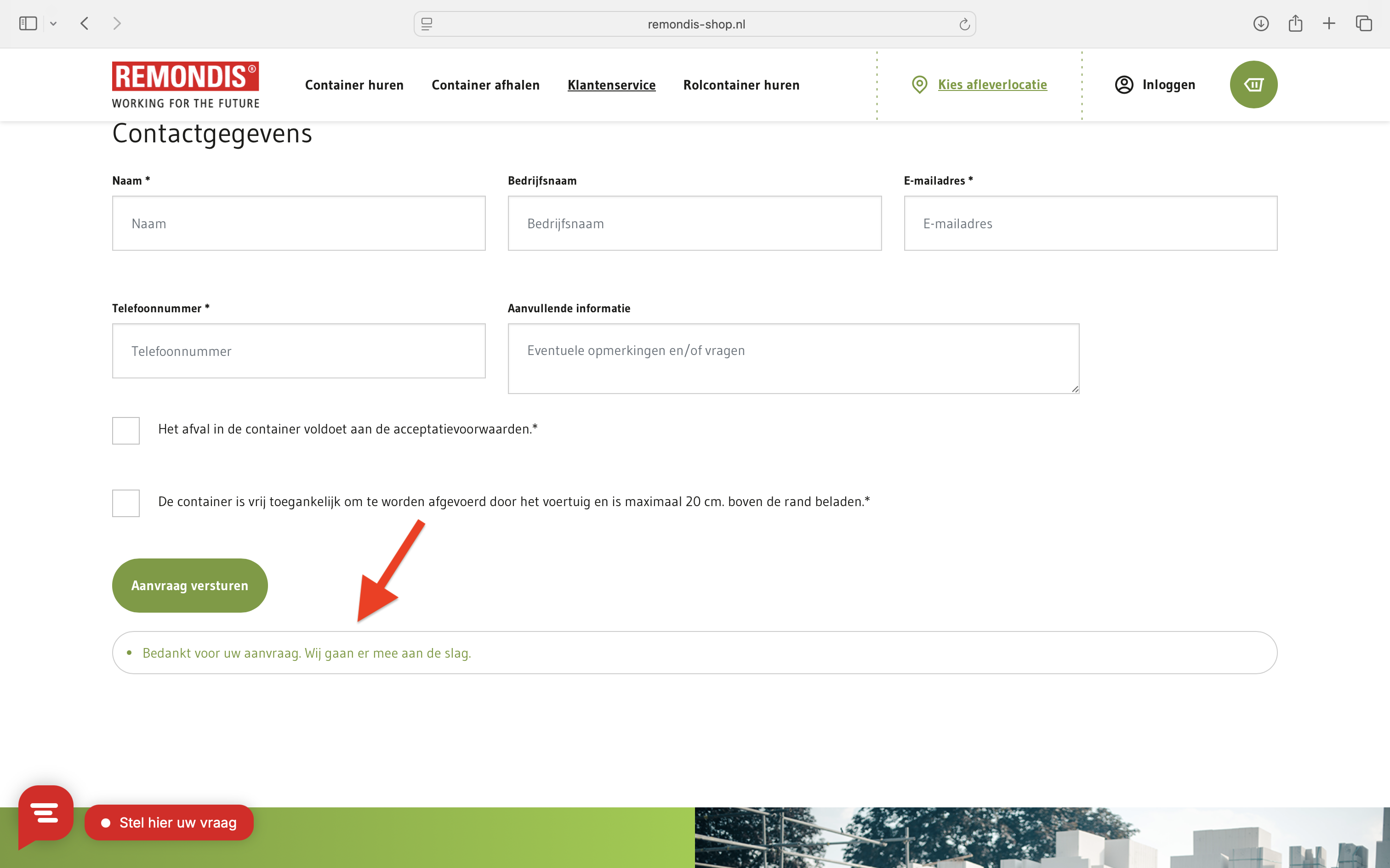 Na het versturen verschijnt er onderaan uw scherm een bevestiging (zie afbeelding). Wij hebben uw verzoek ontvangen en plannen de afhaling in op de door u gekozen datum, indien mogelijk.